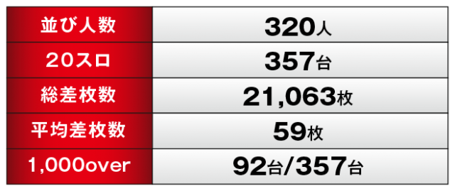 終わってみれば優秀台・ピックアップ機種の活躍もあり、20スロ357台のトータル差枚数は+21,063枚と見事な快勝で幕を閉じた。
