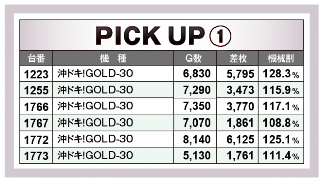 その他、『沖ドキ!GOLD-30』では+6千枚超と+5千枚超が1台ずつで6台のトータル差枚数は+2万2千枚オーバーを記録し、こちらも他機種に負けない数値を誇った。