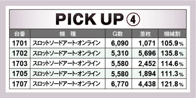 また、『スマスロ北斗の拳』6台では、1501番台の+6,041枚を筆頭にトータル差枚数は+2万枚に迫る勢いだった。さらに、『スロットソードアート・オンライン』5台では1702番台の+5,696枚を筆頭にトータル差枚数は+1万5千枚オーバーをマーク。スマスロ機の威力が際立っていた。