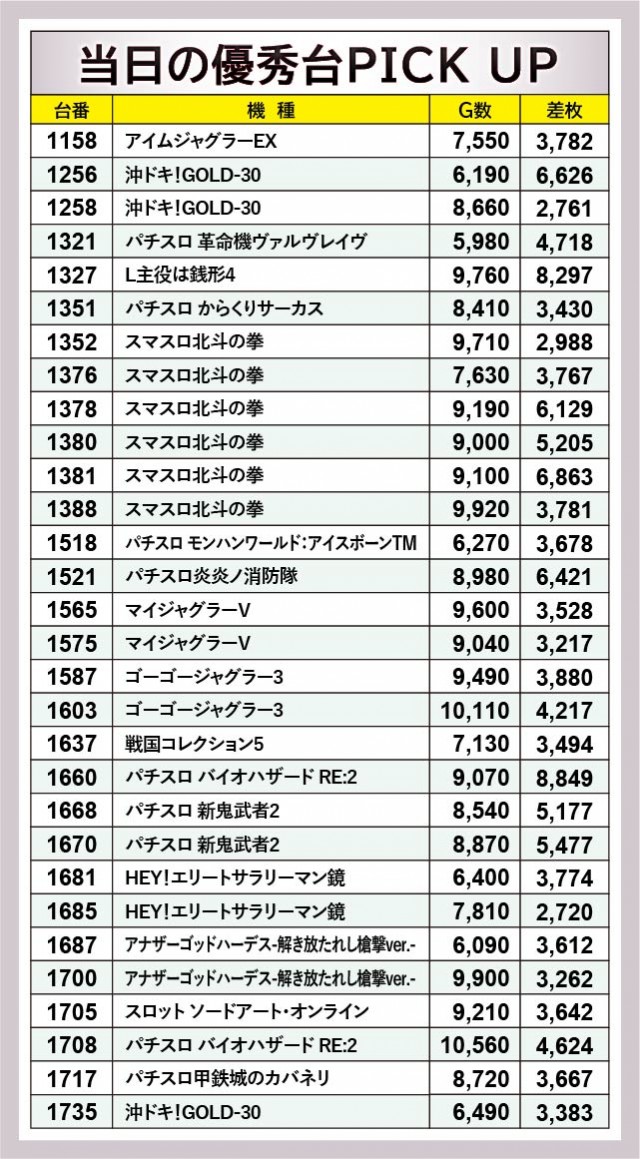 優秀台をチェックすると、5千枚OVERが目立つ内容に。大きな熱気を放っていたことを証明する数字で、その中で特に秀でていたのが『L主役は銭形4』1327番台+8,297枚や『パチスロ バイオハザード RE:2』1660番台+8,849枚だ。また朝から終日を通して打ち込まれている点も見逃せず、2台の万回転OVERが発生した事実からも、相当な手応えを感じていたのは間違いない。