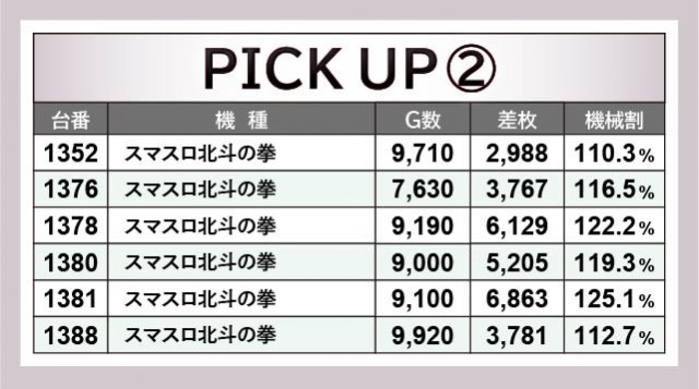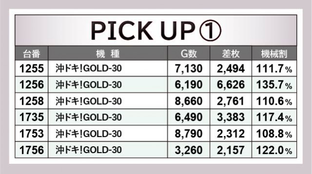 『沖ドキ!GOLD-30』はじっくりと打ち込まれ形跡を確認でき、1256番台+6,626枚のように右肩上がりにグラフを伸ばす台が多く見られた。それは『スマスロ北斗の拳』も同様で、1378番台+6,129枚や1381番台+6,863枚と、大台を突破する台が目立っている点も好印象であるばかりだ。これら大量設置されたメイン機種がしっかりと活躍してくれた事実は、ファンにとって何よりも嬉しいのではないだろうか。