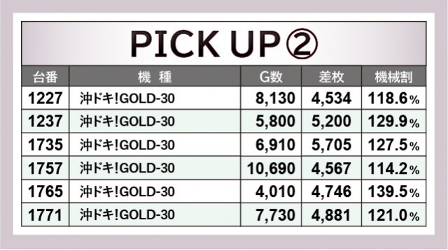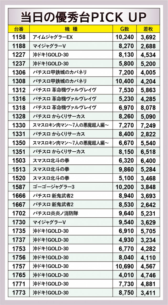 上表の優秀台をチェックすると、数多くの機種で5千枚OVERという大台突破台が見られる。その中で突出した数字を叩き出したのが『パチスロ 革命機ヴァルヴレイヴ』1318番台+8,078枚で、そのほかにも『スマスロキン肉マン~7人の悪魔超人編~』1330番台+7,249枚が続いた。また『沖ドキ!GOLD-30』の島はドル箱が乱立する状況となり、多くのファンが笑顔の華を咲かせていたのが印象的だ。