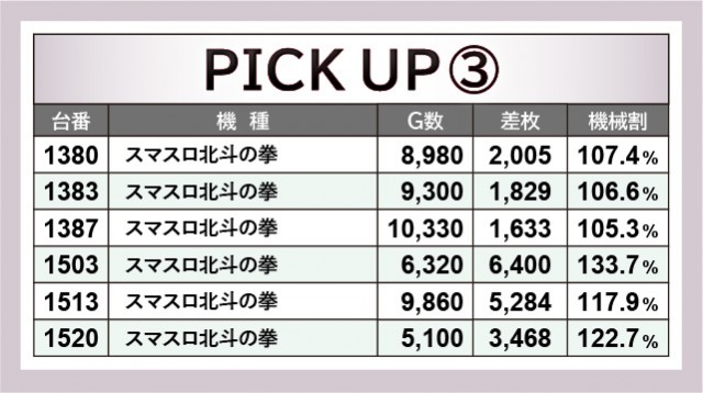 『アイムジャグラーEX』『沖ドキ!GOLD-30』『スマスロ北斗の拳』と、これら人気と実力を兼ね備えた機種群が活躍していたという事実は、多くのファンにとって安心できる内容だろう。『アイムジャグラーEX』はコンスタントなボーナス当選で魅了し、『沖ドキ!GOLD-30』『スマスロ北斗の拳』は大きな熱量でファンを夢中にさせていた。回転数と差枚数が比例する展開も顕著で、今後もこれら機種が盛り上がりをリードしてくれるのは間違いない。