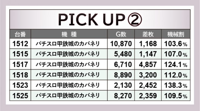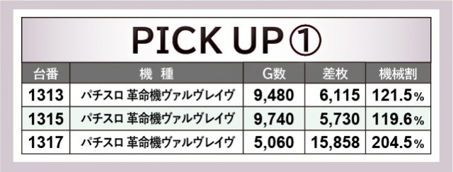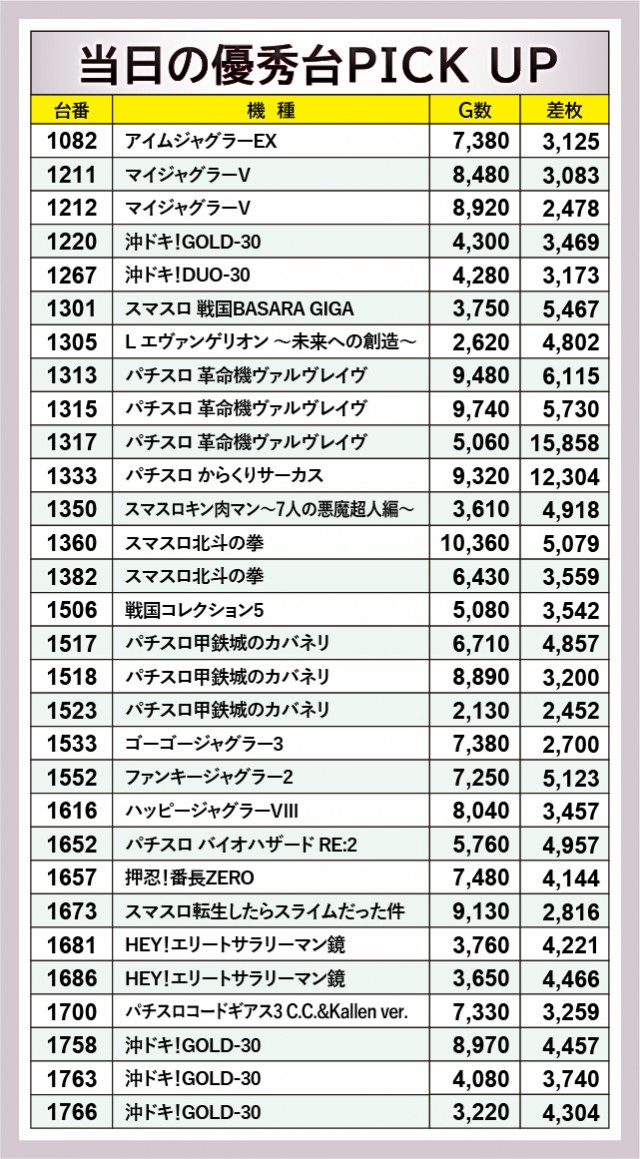 『パチスロ 革命機ヴァルヴレイヴ』の活躍は前述したとおりだが、ほかにも5~6千枚OVERが発生しており、熱気の中心になっていたのが分かる。また『パチスロ甲鉄城のカバネリ』同様に人気機種であるが由縁を見せつけ、万回転OVERを筆頭に3~4千枚OVERという記録を打ち立てた。いずれも閉店まで粘り強く打ち込まれているため、ファンは相当な好感触を得ていたのは間違いないないだろう。