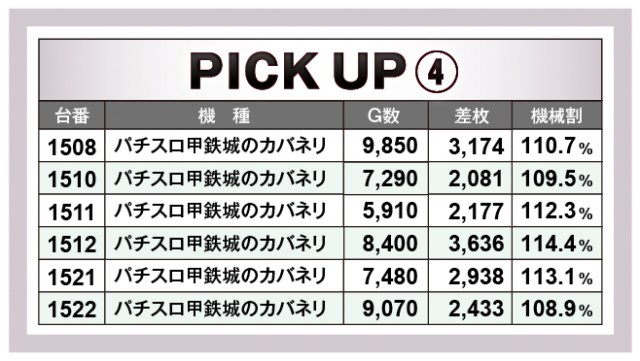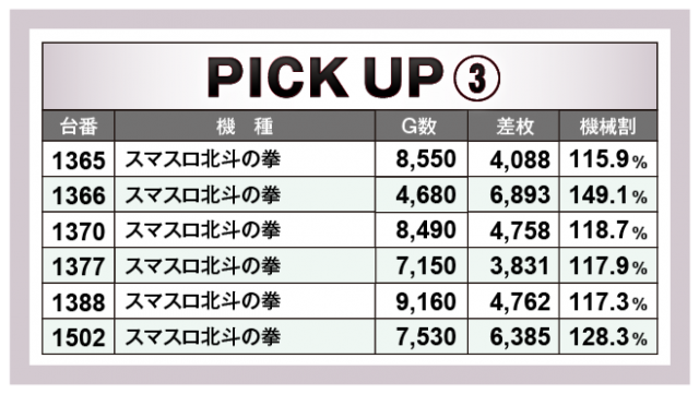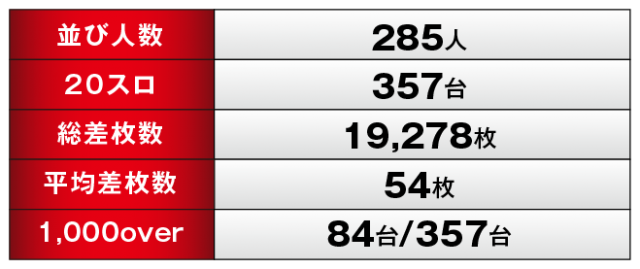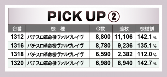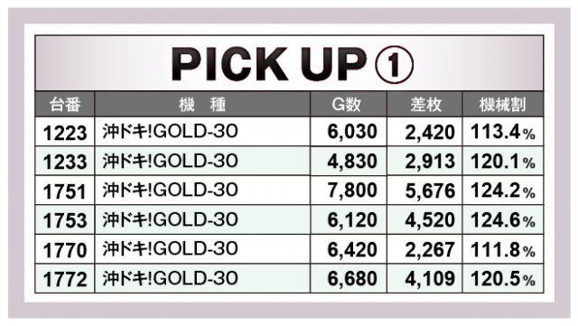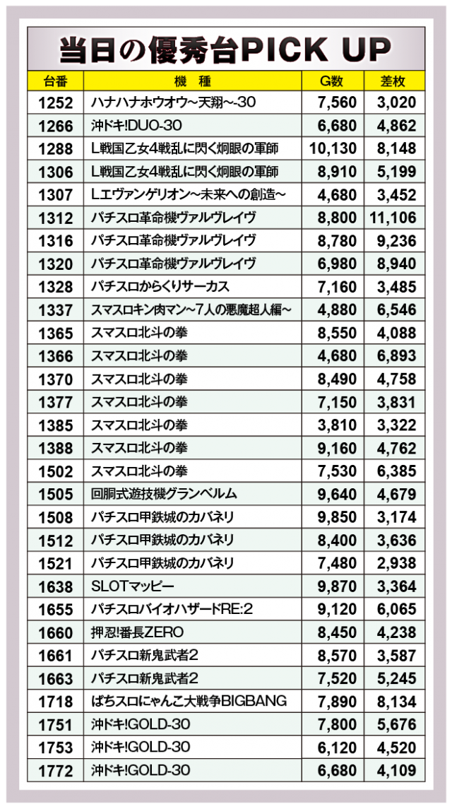 続いては当日の好調機種をみていこう。まずは『沖ドキ!GOLD-30』で、1751番台・+5,676枚を筆頭に6台のトータル差枚数は+2万1千枚オーバーを記録した。人気シリーズのスマスロ機から『パチスロ革命機ヴァルヴレイヴ』、『スマスロ北斗の拳』がともに、ピックアップのトータル差枚数は+3万枚オーバーをマークし、凄まじい熱気を放っていた様子が顕著だ。また、不動の人気機種『パチスロ甲鉄城のカバネリ』では、+2千枚オーバー台が多発し、6台のトータル差枚数は+1万6千枚オーバーをマーク。いずれも安定感のある状況にファンは心地良さを覚えながらレバーを叩いていたに違いない。