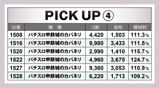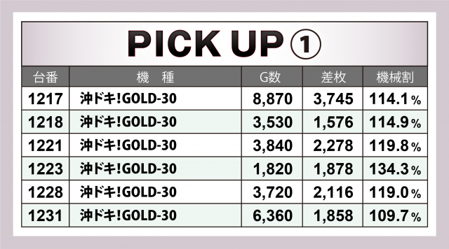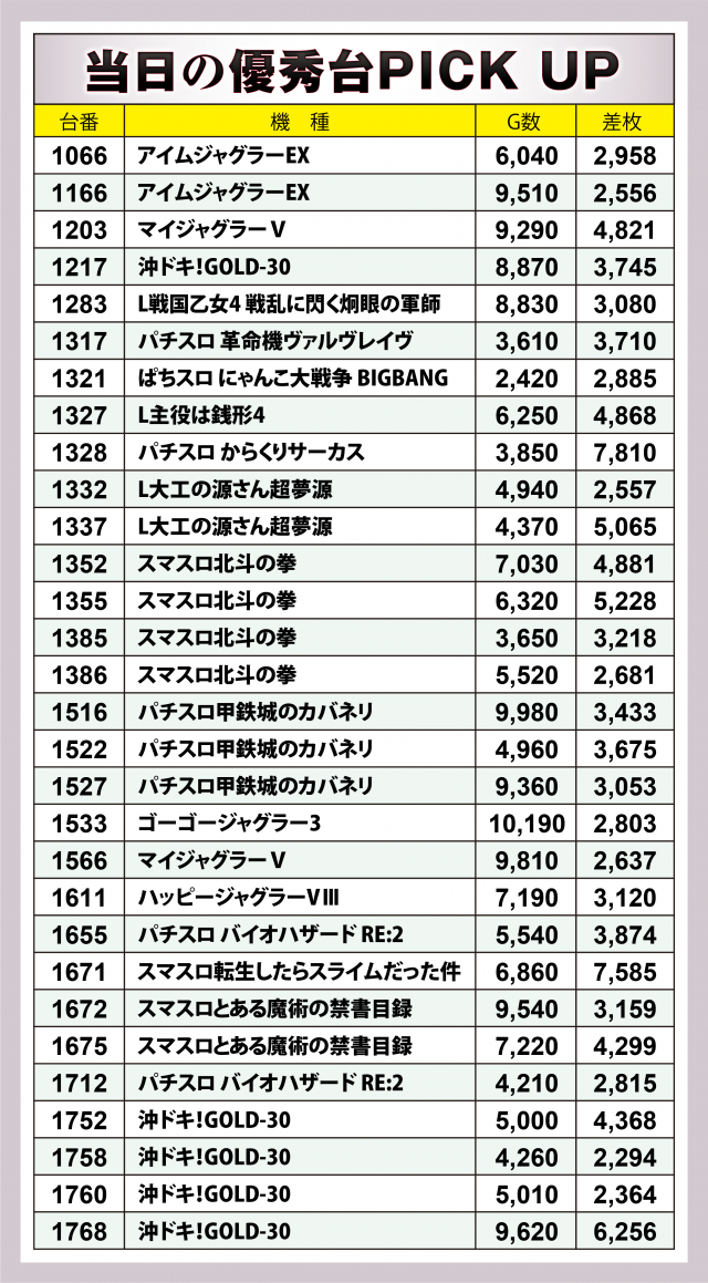 お次は当日好成績を残した3機種計24台にズームイン。3機種はいずれも同店取材では好調マシンの常連であり、その24台全てが4桁のプラス差枚数を実現した。