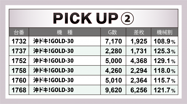 まず『沖ドキ!GOLD-30』12台は今回もハイスコア台を連発。+6千3百枚弱を筆頭に、+4千枚超×1・+3千枚超×1・+2千枚超×4、そのトータルは+2万6千枚を突破した。