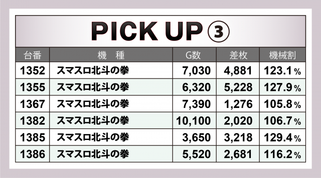 また、『スマスロ北斗の拳』6台は+5千3百枚弱をトップに、+4千超×1・+3千超×1・+2千枚超×2と、合計は+1万9千枚オーバーを計上した。