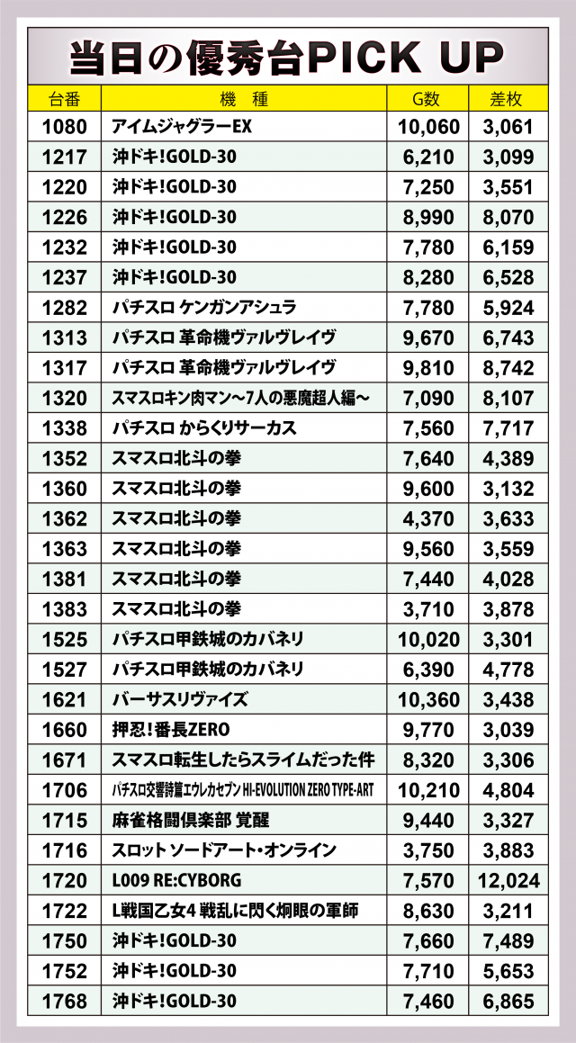 最初は優秀30台のPICK UPから。今回は前回を超えるハイクラスぶりとなり、30台の全てが差枚数+3千枚以上をマーク。さらに+4千枚オーバーは全体の半数強となる16台、+5千枚オーバーは全体の4割となる12台、+6千枚オーバーが全体の3分の1となる10台、+7千枚オーバーが6台、+8千枚オーバーが4台と、30連勝の日をも超えるような高水準を果たした。