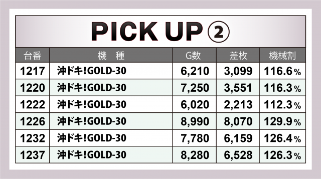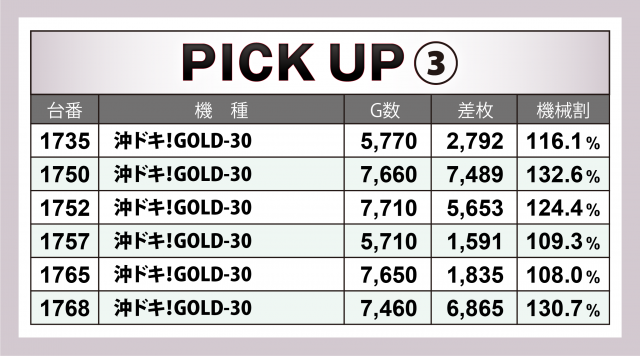 前回続いて『沖ドキ!GOLD-30』は12台が対象。+8千1百枚弱を頂点に、+7千枚超×1・+6千枚超×3・+5千枚超×1と高い差枚数が連発、そのトータルは+5万6千枚目前に至った。