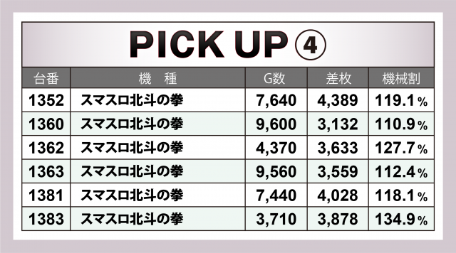 また、『スマスロ北斗の拳』6台は+4千枚オーバー2台をツートップに、+3千超×4と、合計は+2万3千枚弱を計上した。
