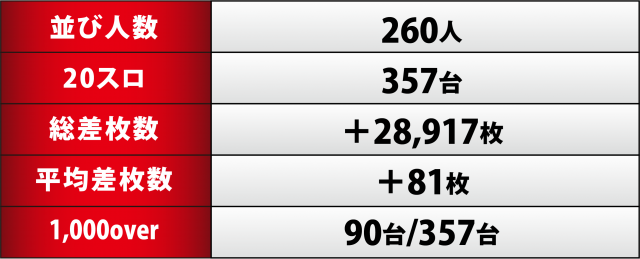 今回、20スロ357台のトータル差枚数は+28,917枚となり、全台トータルプラス30連勝に成功した前回を上回る成績でのフィニッシュとなった。