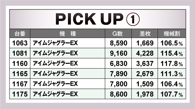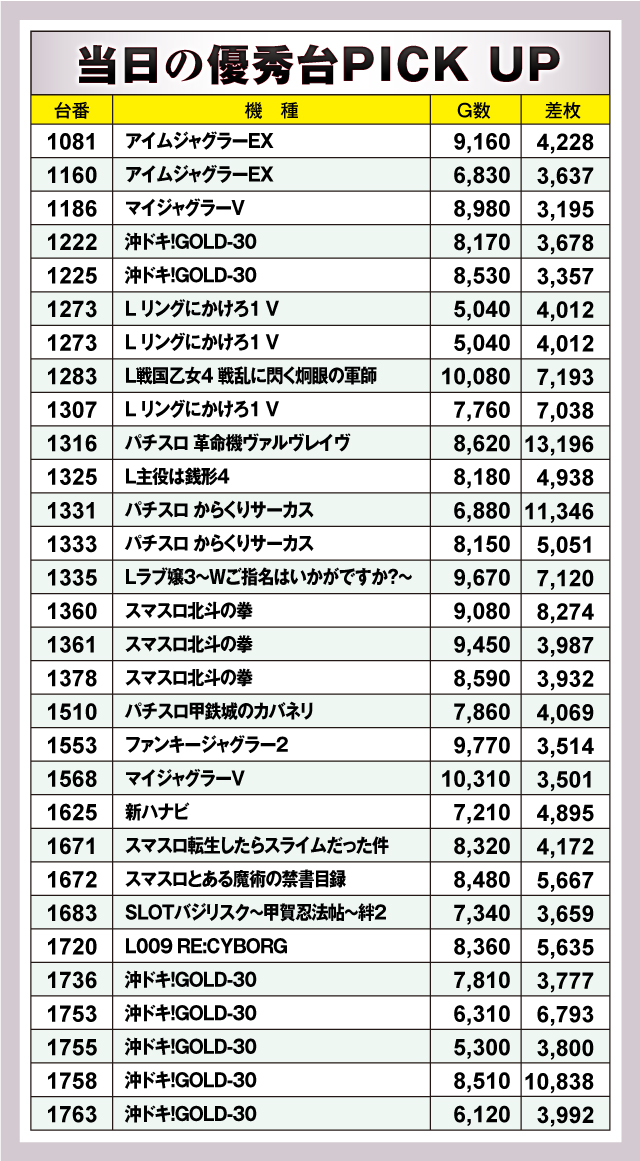 まずは優秀30台のPICK UPの紹介から。今回も前回に引き続き30台すべてが+3,000枚オーバーで、+5,000枚オーバーは11台。そして+10,000枚オーバーは3台という結果に。それらのなかでもっとも優秀だったのは、1316番台の「パチスロ 革命機ヴァルヴレイヴ」で差枚+13,196枚をマーク! ピックアップ30台を見渡すとスマスロを筆頭にノーマルタイプも多数ランクインしていたことから、多種多様な機種にチャンスが隠されていた可能性が高そうだ!