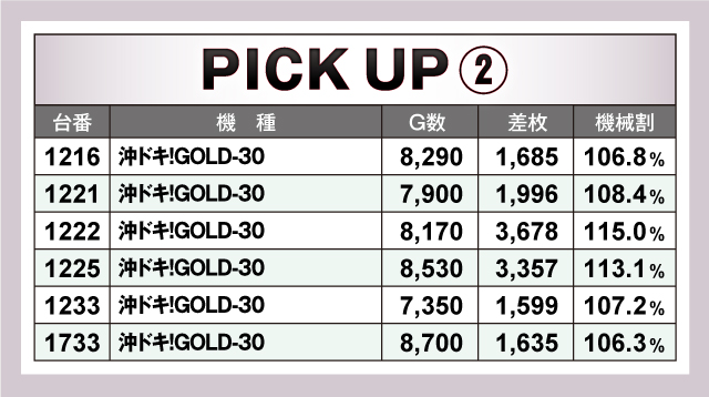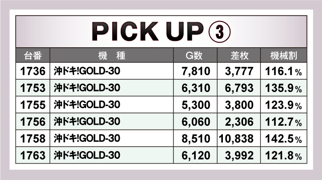続いては、当日の好調台3機種をピックアップ。3機種全てが平均+2,000枚オーバーで、とくに「沖ドキ!GOLD-30」のピックアップ12台の平均差枚は、+3,788枚と絶好調! また「スマスロ北斗の拳」も優秀で、平均8,753Gの平均差枚+3,698枚とこちらも圧倒的な結果を残していた!