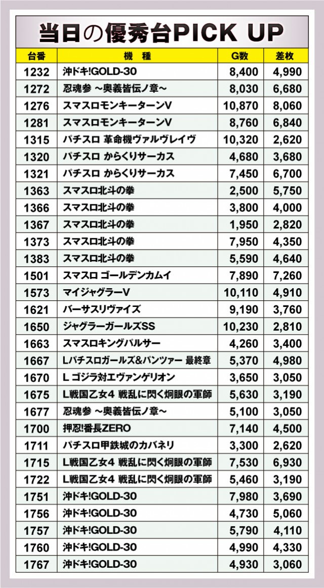 今回の優秀台は上表の通り。優秀台の台数が多いのは『沖ドキ!GOLD-30』と『スマスロ北斗の拳』の2機種。これらだけでなんと11台にも上っている。当店での人気所に設定が入っていそうな気配だ。