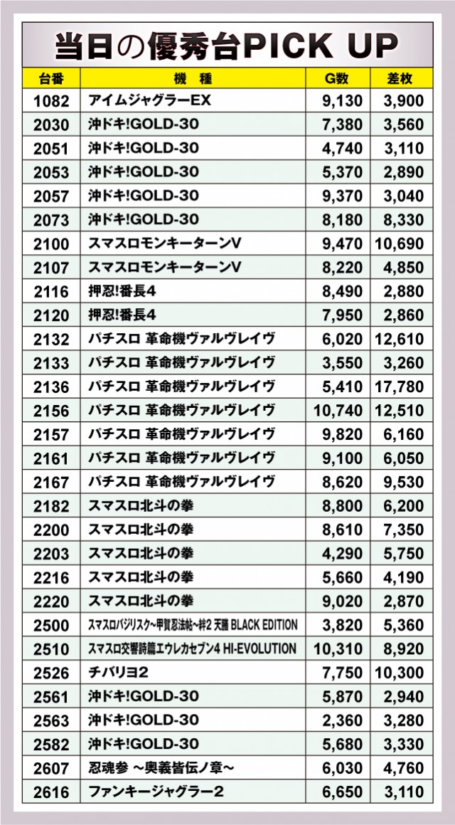 一方でスマスロの革命児『パチスロ 革命機ヴァルヴレイヴ』も優秀台が多い。しかも万枚オーバーが3台もあり、当店の本気度が分かる。