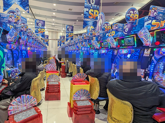 大箱6箱以上や大箱3箱以上の持ち玉を使い、楽しそうに遊技をおこなっている姿をとらえた。