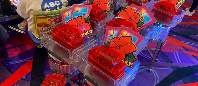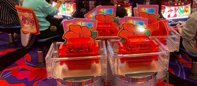 スマスロに対抗したのが沖スロコーナー。『沖ドキ!GOLD-30』『沖ドキ!BLACK』『沖ドキ!ゴージャス-30』といった沖ドキシリーズに加え『ドラゴンハナハナ~閃光~ 30』ではドル箱別積みの量が光っていた。