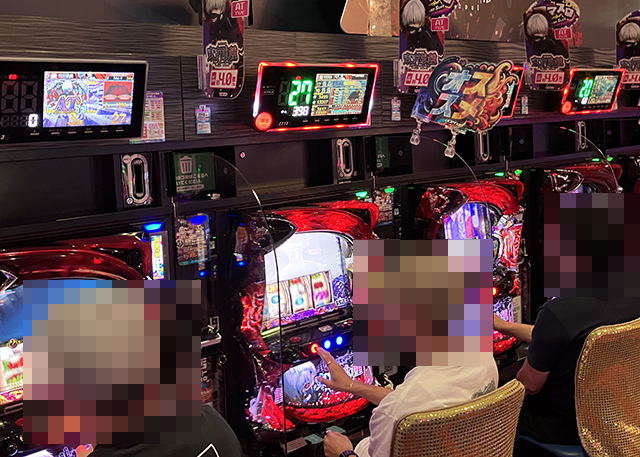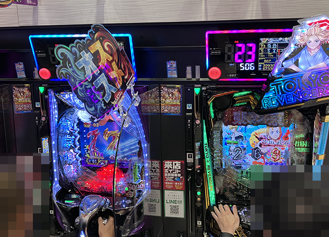 「e 東京喰種」や「e東京リベンジャーズ」、「e牙狼12黄金騎士極限」など、あちこちに遊技を満喫しているような姿があった。