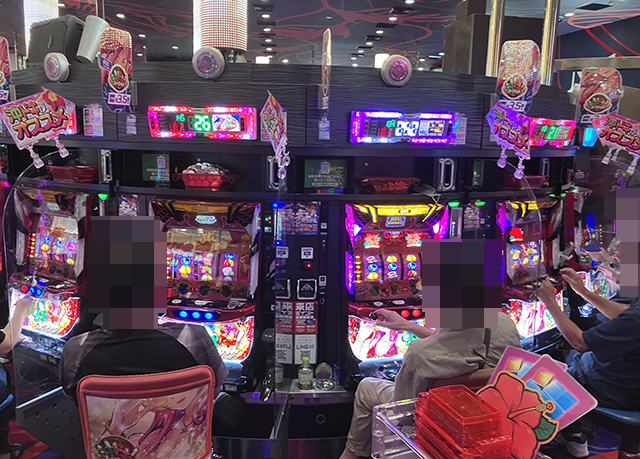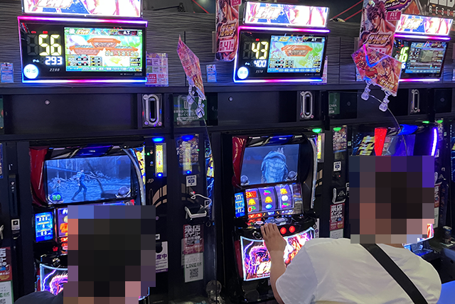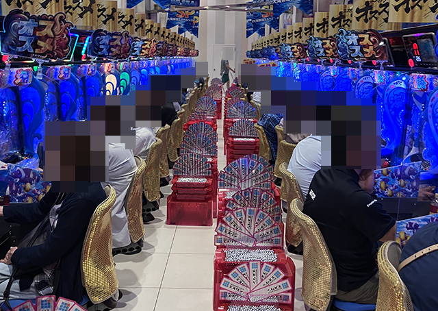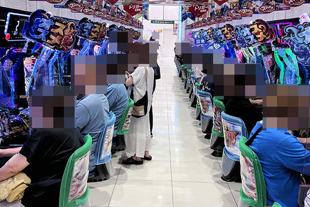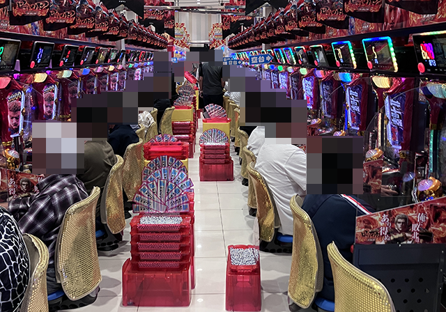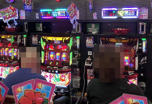 持ち玉で遊技をおこなっているプレイヤーが多く、どちらの機種でも3箱以上の持ち玉がみられた。