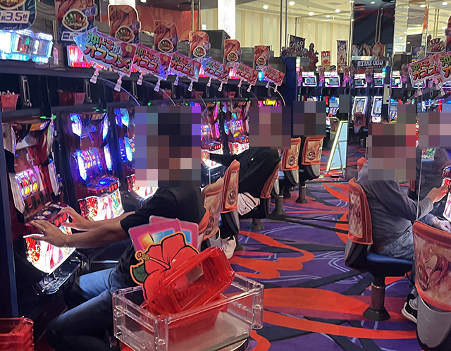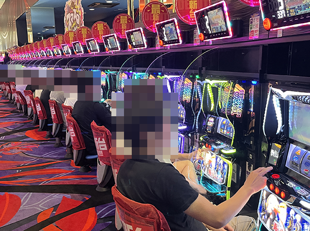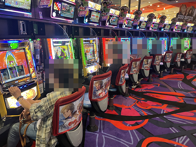 「マイジャグラーⅤ」も人気があり、うれしそうにレバーを叩いている姿が並んでいた。