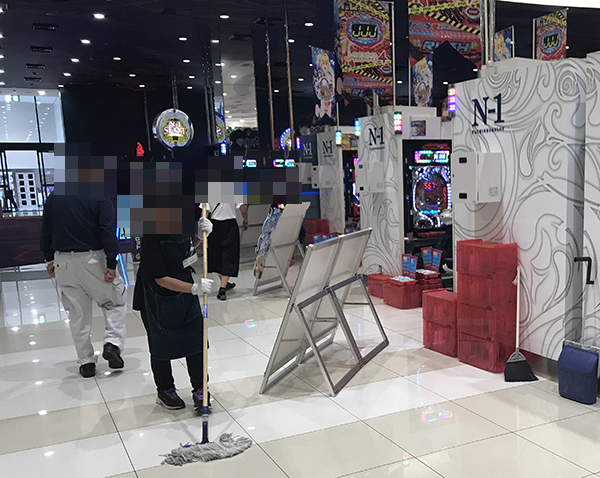 遊技スペースや通路、トイレなど、ホール内のすみずみまで清潔じゃった「エヌワン郡山店」。スタッフが丁寧に清掃をしている姿からは、環境面に対する意識の高さもうかがえた。