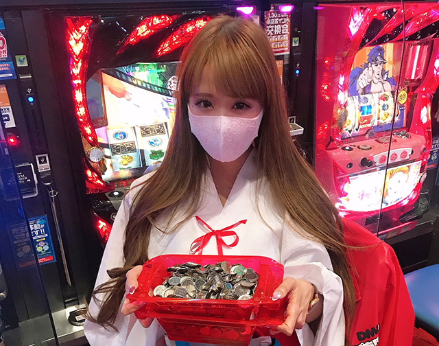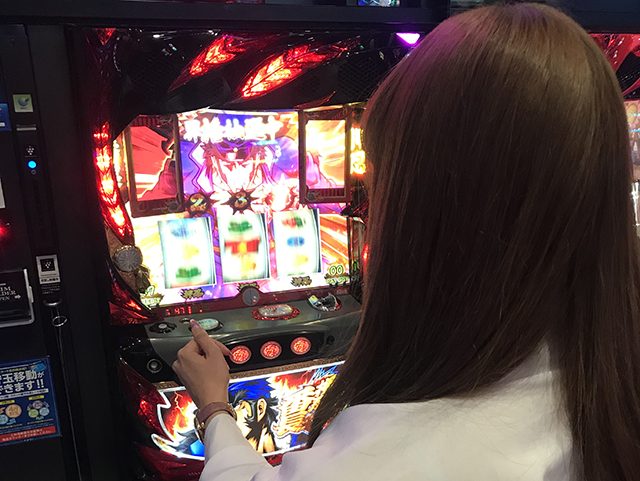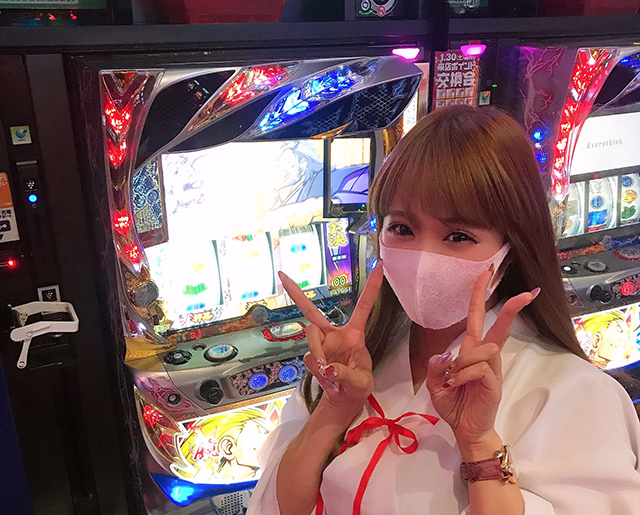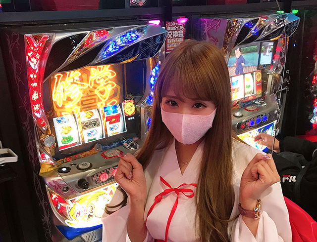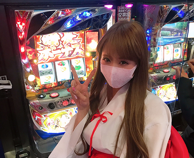 パチスロをみると、さやちゃんが実戦をしている「押忍!番長3」でお客さまが笑顔で活躍!