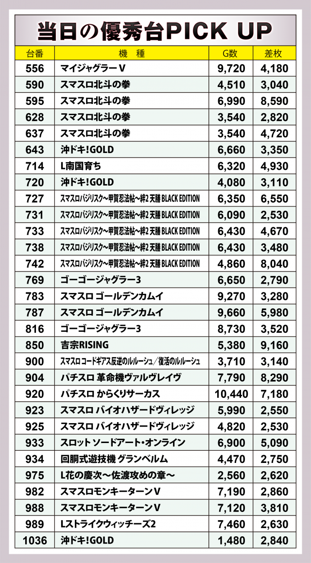 しかし上位30台の数値や+5千枚超をマークした台の数を考えると一見不可思議に感じられる。恐らくこの日はプラス台とマイナス台のメリハリが効いた営業が行われていたのではないだろうか。同店で勝利を目指すなら頭に入れておきたい重要事項ではないだろうか。