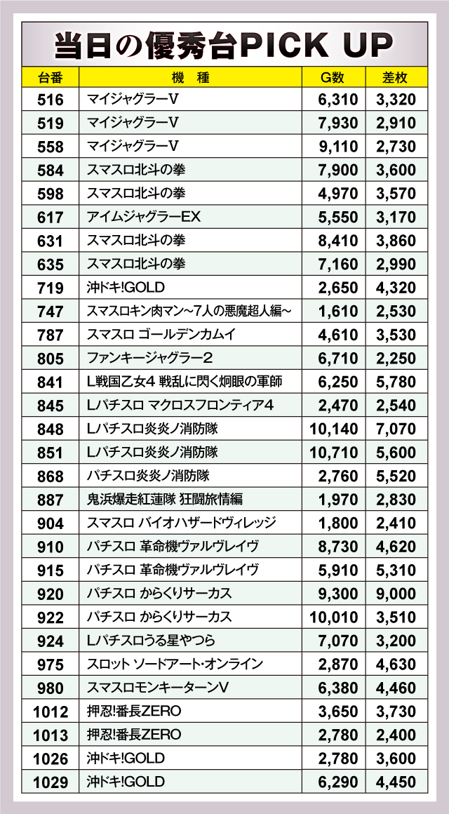 上表の優秀台をチェックしていくと、実に様々な機種がランクインしていることがわかる。これは、ホール内の至るところにチャンスが存在していたことを表しており、中でも『パチスロ からくりサーカス』920番台+9,000枚や『Lパチスロ炎炎ノ消防隊』848番台+7,070枚など、熱気にあふれる台の出現も確認できた。