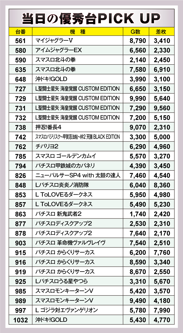 優秀台を見てみると、『L聖闘士星矢 海皇覚醒CUSTOM EDITION』が素晴らしかった。大台まであと少しの+9,560枚を記録した731番台を筆頭に、729番台が+5,640枚、732番台が+5,150枚、727番台が+3,150枚と優秀台がズラリ。人気シリーズらしいポテンシャルの高さを見せてくれた。それに続いたのが『パチスロ炎炎ノ消防隊』。848番台が+8,360枚をマークしている。『L ゴジラ対エヴァンゲリオン』も負けてはいない。997番台が+7,990枚を叩き出し、実力をアピールした。それと僅差だったのが『パチスロ からくりサーカス』で、915番台が+7,750枚を記録している。以下、『スマスロ北斗の拳』635番台が+6,910枚、『Lパチスロうる星やつら』925番台が+5,670枚、『L ToLOVEるダークネス』857番台が+5,230枚と続き、盛り上がりを見せていた。