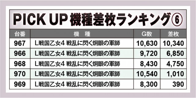 万枚OVERを達成した『L 東京喰種』『パチスロ からくりサーカス』『L戦国乙女4 戦乱に閃く炯眼の軍師』は大きな熱気を発して盛り上がりを牽引。『Lパチスロ 機動戦士ガンダムSEED』など半数以上でプラス差枚数を達成する機種も見られ、優秀機種はいずれも大きな可能性を秘めていた様子だ。『新ハナビ』も全台プラス差枚数で存在感を放っており、いずれも閉店まで活気が絶えなかったのも見逃せないポイントだ。