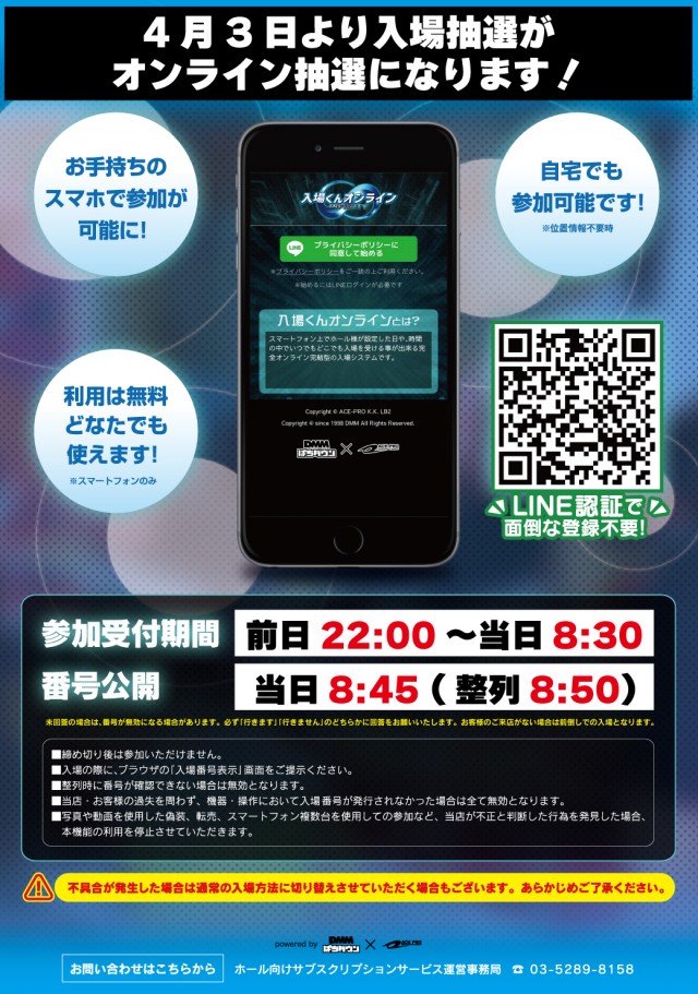 4月3日からオンライン抽選に変わりました。【8:30 参加締切】【8:45 番号発表】【8:50 整列】【9:00 入場】 |