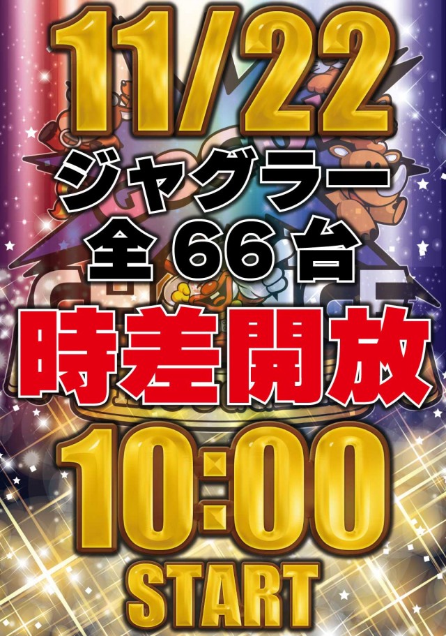 本日ジャグラーコーナー全66台【10:00】開放となります。