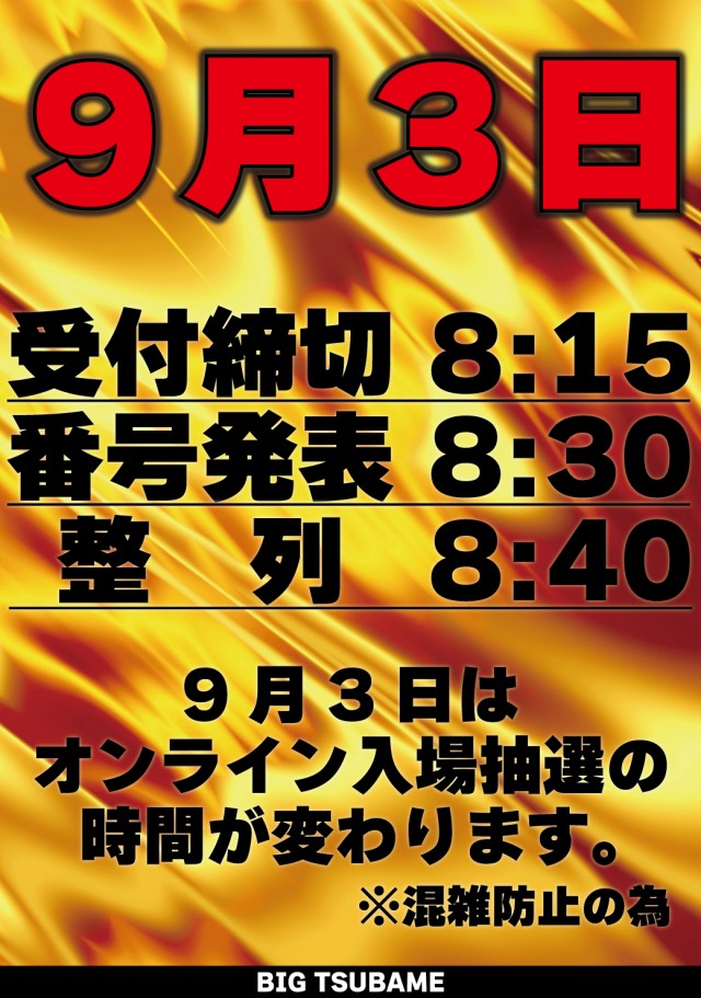 本日9月3日(水)はオンライン入場抽選の時間が変わります。