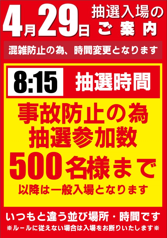 4月3日からオンライン抽選に変わりました。【8:30 参加締切】【8:45 番号発表】【8:50 整列】【9:00 入場】 |