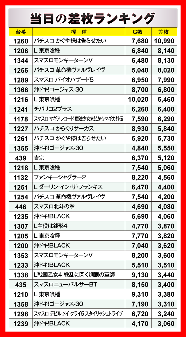 『パチスロ かぐや様は告らせたい』1260番台が+10,990枚と唯一の万枚を達成していて、ひときわ輝く存在だった。そして『L 東京喰種』1206番台が+8,140枚、『スマスロモンキーターンV』1344番台が+8,130枚、『パチスロ 革命機ヴァルヴレイヴ』1256番台が+8,020枚とつづく。他にも『スマスロ バイオハザード5』1289番台の+7,990枚や『沖ドキ!ゴージャス-30』1366番台の+6,800枚など、超優秀台があちらこちらで誕生していた。
