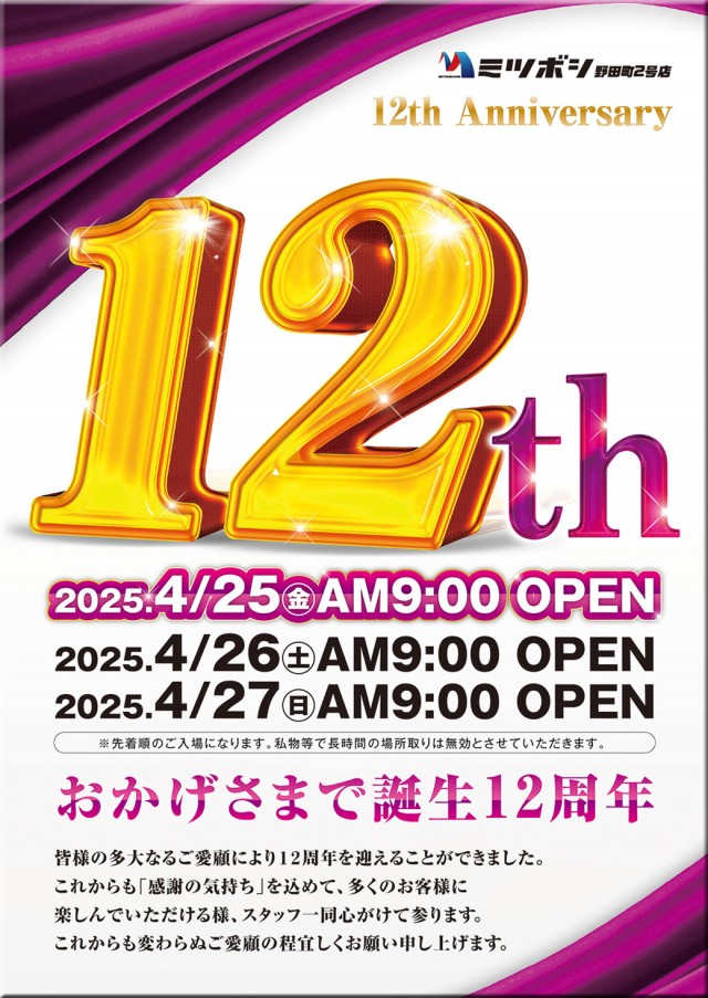 本日25日金曜日 2号店スロット館12周年 朝9時オープン