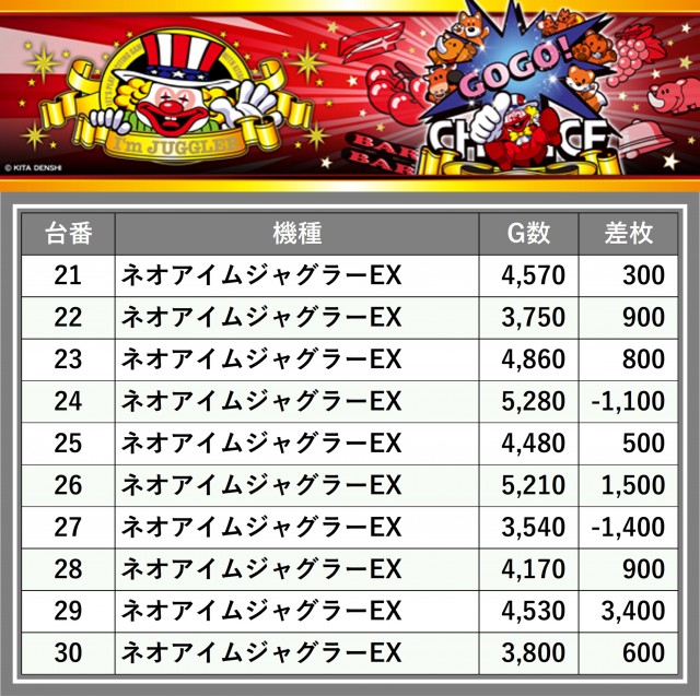 厳選された取材対象機種をはじめ、その他スロット全体から好記録が飛び出した!プレイヤーが楽しんだ1日を下記データにて振り返ってみて欲しい。