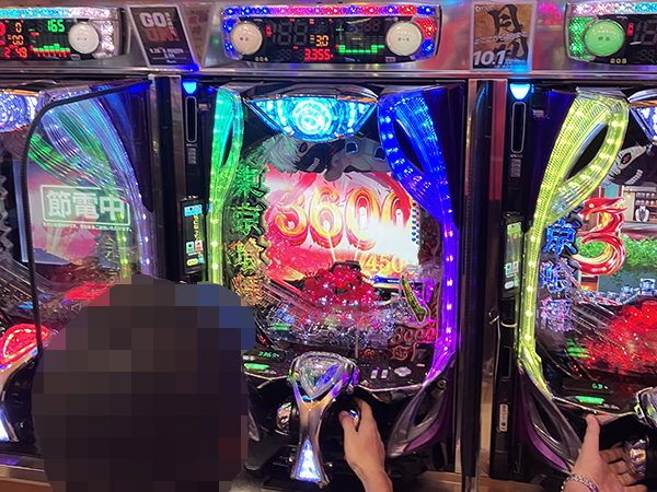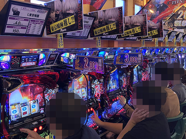 14時ごろの4円パチンコでは「e 東京喰種」や「eフィーバー炎炎ノ消防隊2 紅丸ver.」で好調なプレイヤーが見受けられ、時折見せる嬉しそうな表情が印象に残っている。
