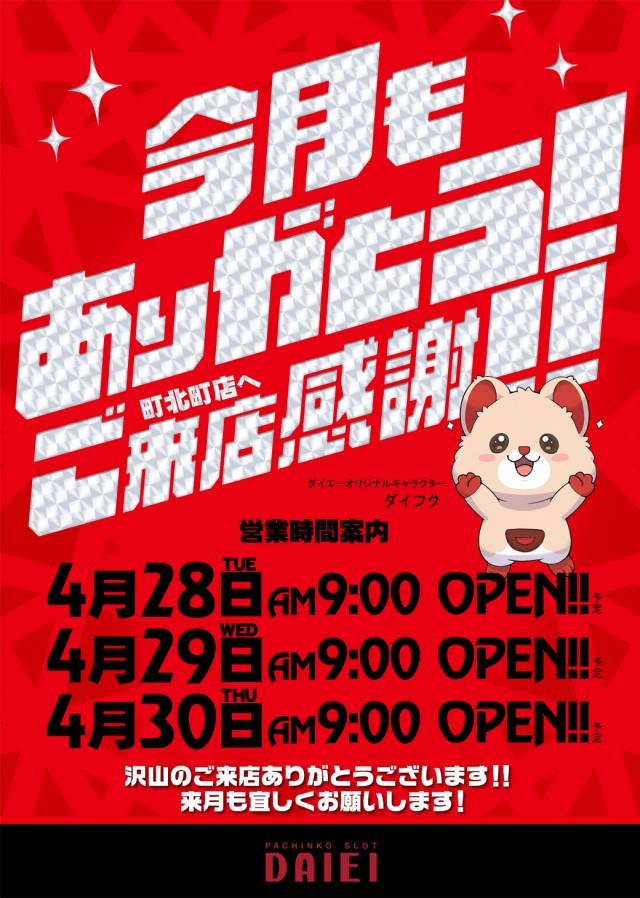 4.28 月末感謝朝9:00オープン!
