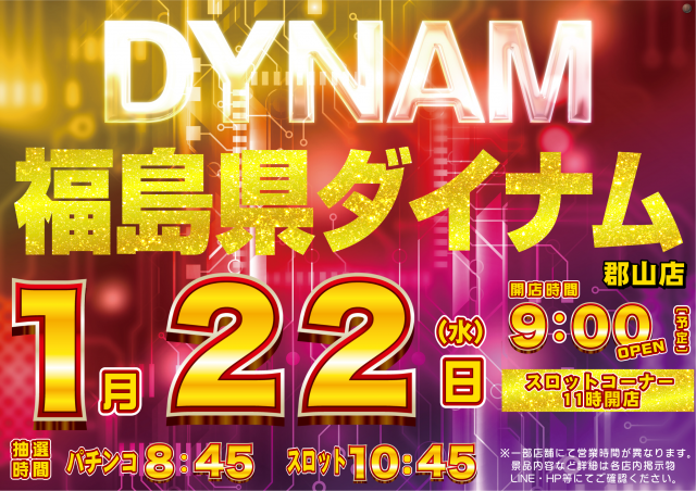 福島県ダイナム9時開店!郡山店はスロット11時オープン!