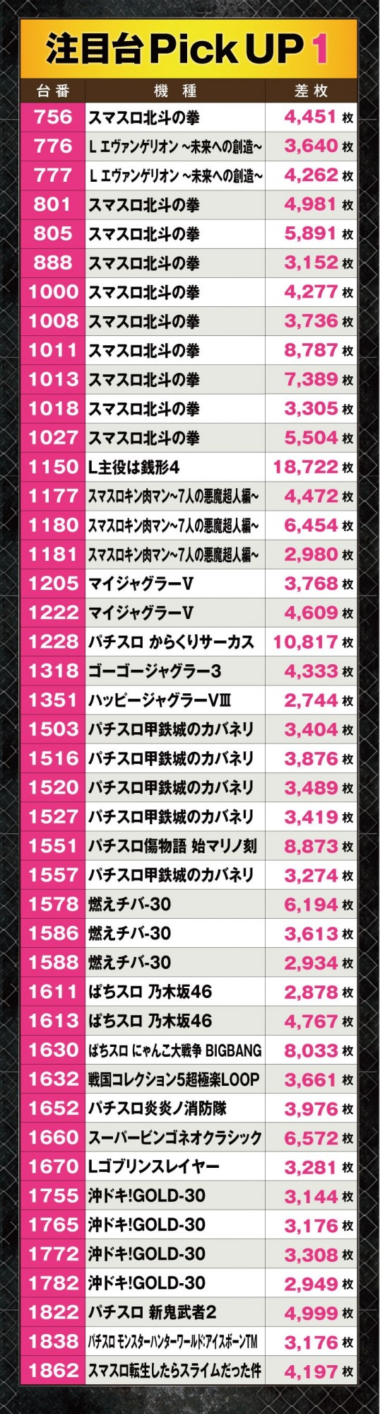 まずは『L主役は銭形4』や『パチスロ からくりサーカス』といったスマスロが大盛況。 +18,722枚、+10,817枚とそれぞれ万枚オーバーを記録している。ほかにも『スマスロ北斗の拳』や『スマスロキン肉マン~7人の悪魔超人編~』、『ぱちスロ にゃんこ大戦争 BIGBANG』が見事な活躍を披露していた。