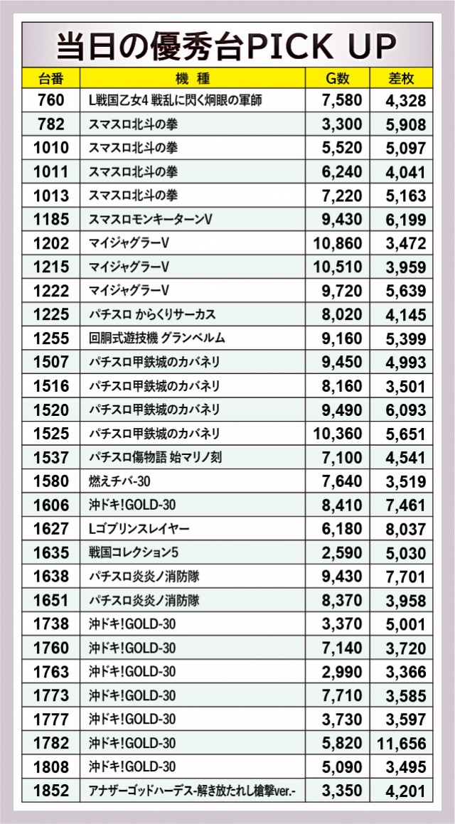 ここまでの2戦、同店では万枚OVERが立て続けに発生した。『沖ドキ!GOLD-30』1782番台+11,656枚と大きな数字を残しており、さらに当然のように万回転OVERも生まれていたことから、同店の高い実力を実感する内容となっている。また熱量に関しては、『Lゴブリンスレイヤー』1627番台+8,037枚や『パチスロ炎炎ノ消防隊』1638番台+7,701枚という記録も確認でき、満足感に満ちた店内状況だったと言えるだろう。