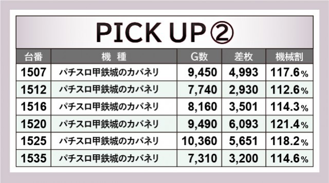 『マイジャグラーⅤ』は活気と熱気に包まれたエリアとなり、その中で1202番台10,860G・+3,472枚と、見るからに有意義な時間を過ごせた台が生まれた。熱量も1222番台+5,639枚と十分で、老若男女問わず愛される機種である由縁を見せつけている。また『パチスロ鋼鉄城のカバネリ』も同様で、1520番台+6,093枚を筆頭に熱気に満ちていたのも見逃せない。