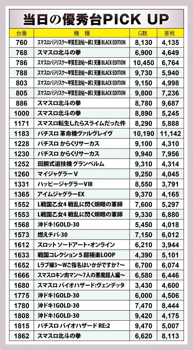 下で挙げる好調3機種以外では何と言っても+1万1千枚を突破した『パチスロ 革命機ヴァルヴレイヴ』がビッグプレー。その他、+8千枚弱&+4千3百枚超が1台ずつの『パチスロ からくりサーカス』、+6千9百枚弱&+5千3百枚弱が1台ずつの『L戦国乙女4 戦乱に閃く炯眼の軍師』、いずれも+6千枚オーバーを果たした『スマスロキン肉マン~7人の悪魔超人編~』『Lラブ嬢3〜Wご指名はいかがですか?〜』『燃えチバ-30』などが特に高い差枚数を残した。