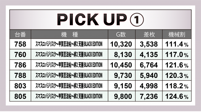 3日間を通して絶好調となったのが『スマスロバジリスク~甲賀忍法帖~絆2 天膳 BLACK EDITION』6台。上から順に+7千2百枚超・+6千枚クラス×2・+4千枚クラス×2・+3千枚超×1、合計は+3万3千枚弱、1台あたりの平均は+5千4百枚超となった。