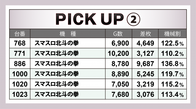 『スマスロ北斗の拳』6台では、886番台が+9千7百枚弱と万枚目前、残り5台も+5千2百枚超×1・+4千6百枚超×1・+3千枚超×3とハイレベル。トータルでは+2万9千枚超を弾き出した。