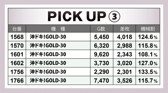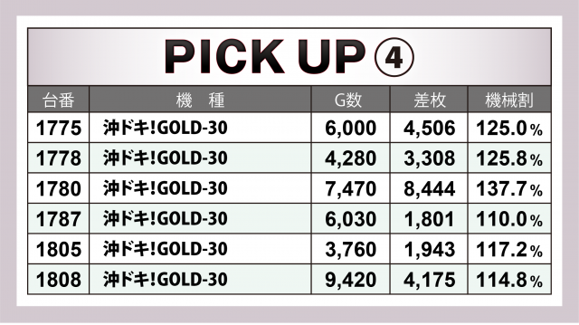『沖ドキ!GOLD-30』も2日目に続いて好出玉が頻出。1780番台が+8千4百枚超でトップとなり、その他に+4千枚超×3・+3千枚超×3・+3千枚超×3、12台合わせて+4万2千枚超をマークした。