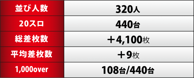 いずれの日もプラス台とマイナス台の両総計を比べると激しい差があり、メリハリの効いた営業が行われていたのは間違いない。プレイできる時間の中で如何に早く優良台に着席できるかが同店における勝利の鉄則と言えるのではないだろうか。