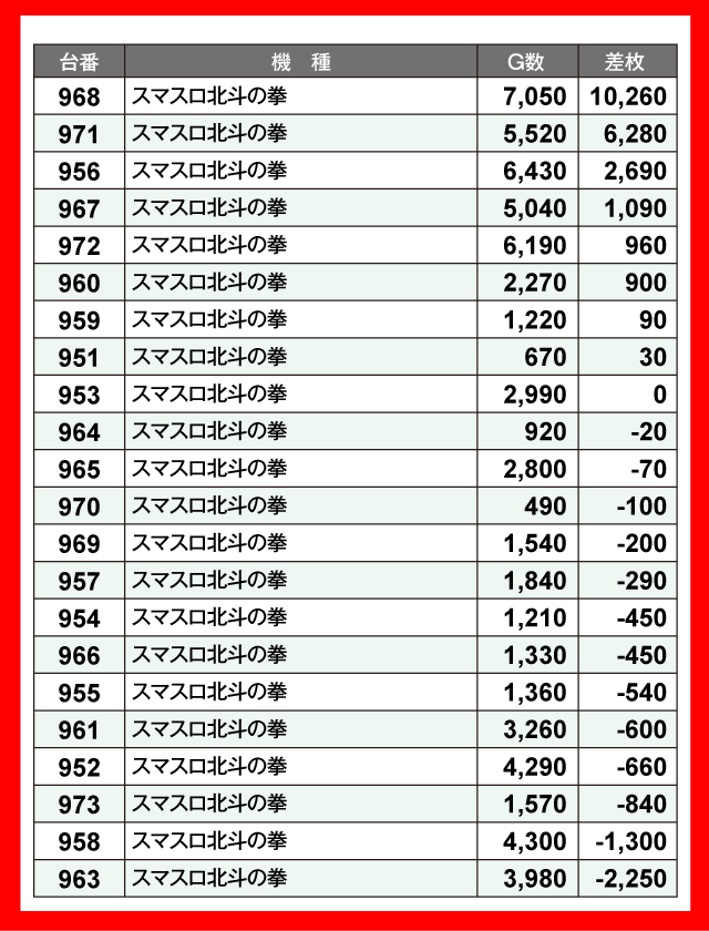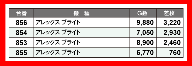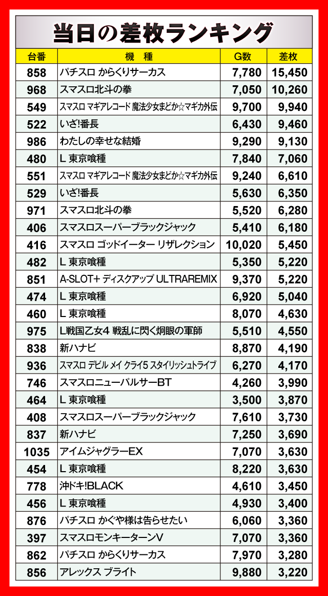 最も輝いたのは長期稼働中の2機種。『パチスロ からくりサーカス』858番台が+15,450枚、『スマスロ北斗の拳』968番台が+10,260枚と、2台が1万枚オーバーを達成している。そして『スマスロ マギアレコード 魔法少女まどか☆マギカ外伝』549番台が+9,940枚、『いざ!番長』522番台が+9,460枚、『わたしの幸せな結婚』986番台が+9,130枚とつづく。さらに『L 東京喰種』480番台の+7,060枚など、誰もがうらやむような優秀台がズラリと並んでいた。